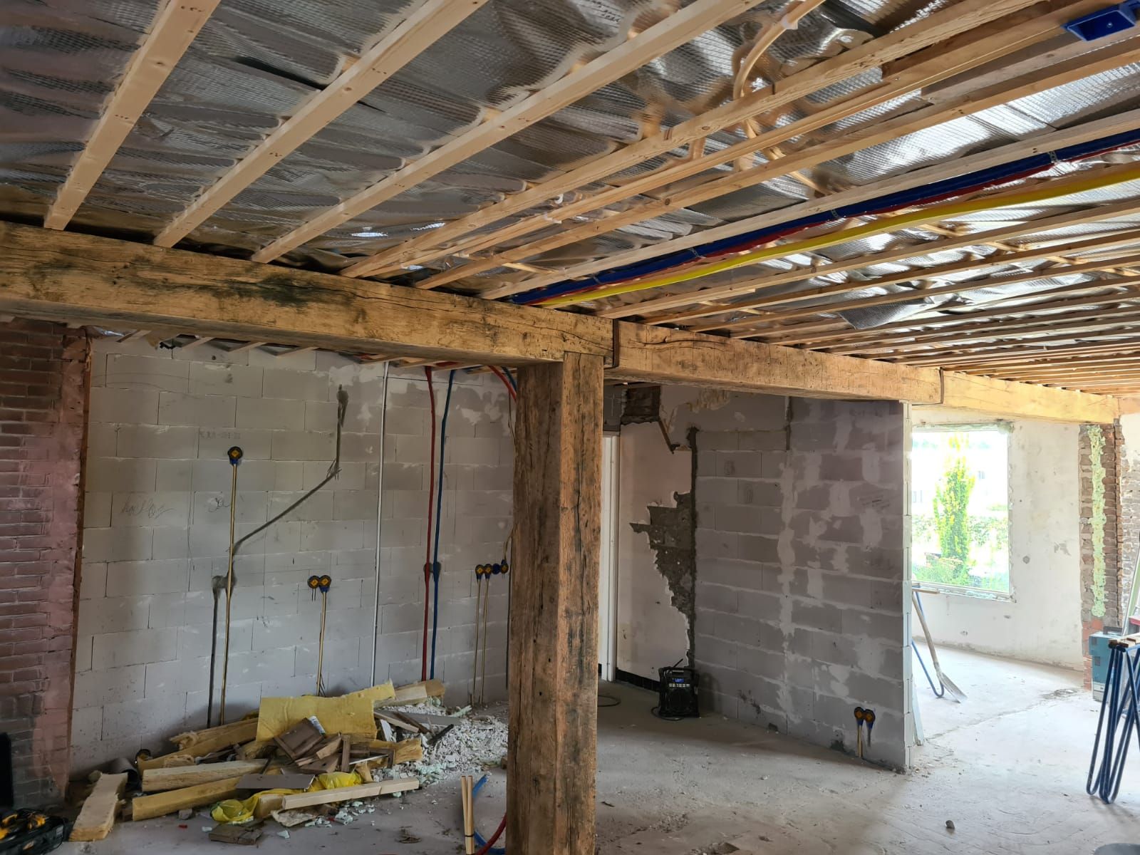 De houten vloeren op de begane grond zijn vervangen door een PS vloer (balkenbroodjes). De gehele benedenverdieping is voorzien van vloerverwarming.
