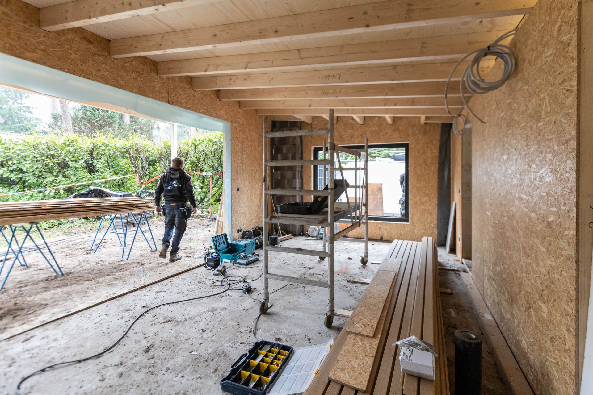 De woonkamer, keuken, toilet en douche werden gerealiseerd.