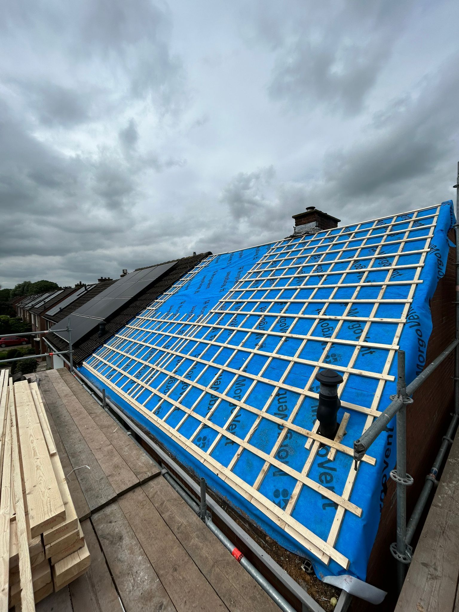 Er werd een nieuw dakbeschot gemaakt, de regels voor de pannen werden op het dak getimmerd.