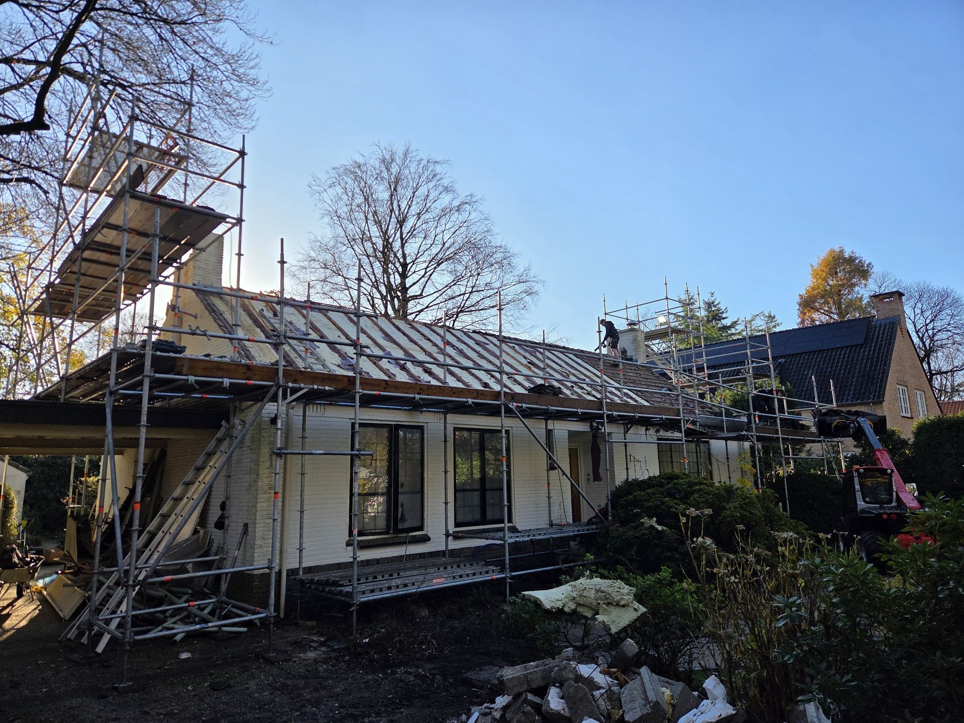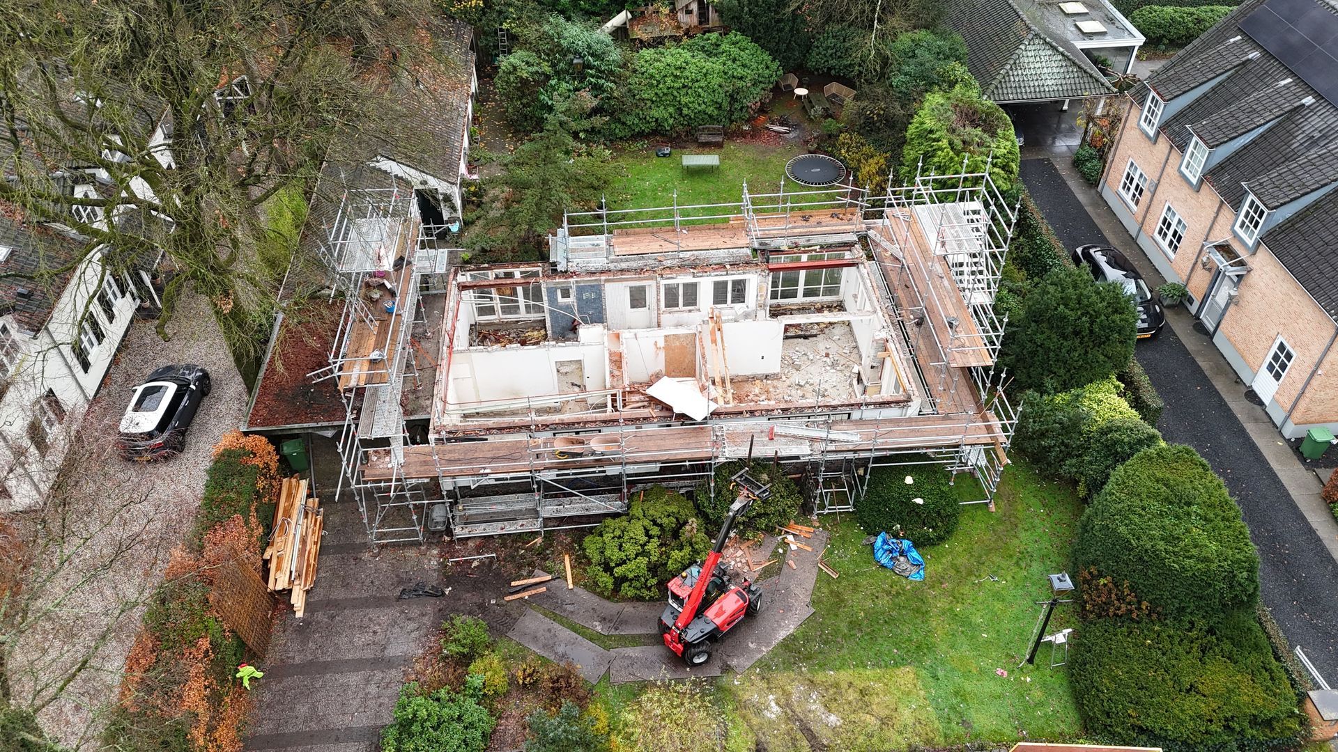 De werkzaamheden begonnen met het slopen van het dak, waarna alle binnenmuren op zowel de begane grond als de verdieping zijn verwijderd. Vervolgens is de nieuwe staalconstructie aangebracht om de gewenste draagkracht en indeling mogelijk te maken. Momenteel zijn wij bezig met het opnieuw realiseren van de ruimtes door het lijmen van kalkzandsteenblokken, waarmee de nieuwe indeling stap voor stap vorm krijgt.